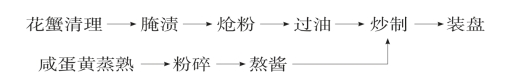(2)熬酱:将咸蛋黄蒸熟,加50克上汤粉碎成糊状,炒锅上火,将黄油化开,投入蛋黄粉糊,慢慢熬至色泽金黄稠黏翻泡,调白胡椒、鸡精粉1克,定味即成蛋黄酱。
