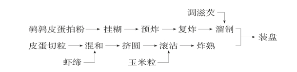 (1)皮蛋预加工:鹌鸽皮蛋剥壳后用干淀粉20克炝拌,挂淀粉脆糊,入180℃油中预炸定型捞出。
