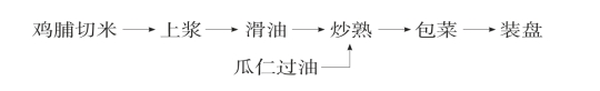 (1)预加工:①将鸡脯去皮,切成米粒丁,加精盐、蛋清、淀粉、清油上浆。②将瓜子仁下140℃过熟。③将臭豆腐干洗净切成0.5厘米小丁,包菜叶洗净晾干待用。