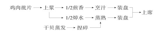 (2)组配:①将干贝蒸发至软,葱白炸黄。②将鸡汤250克入锅上火,加金葱、白酱油,味精、绍酒20克,兑成味汁,烧沸,收浓至1/2。