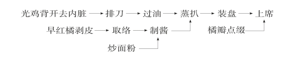 原料:嫩光母鸡1只1500克,早红橘400克,白面粉50克,绍酒15克,精盐10克,味精2克,葱结25克,姜片10克,香叶2张,葱末5克,熟鸡油75克,花生油1000克(耗100克)。