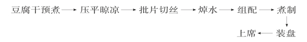 (1)整理:将豆腐干入水锅,加3克盐煮开浸5分钟提出,压平晾凉,运用平推刀法批出薄片,再直切出干丝。干丝细度不超过0.1厘米。