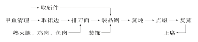 (2)造形蒸熟:将甲鱼块与冬瓜置品锅中垫底,上层用鱼段、火腿、鸡胸肉、甲鱼裙边均批成厚片,在品锅四周摆成四排拼式扇面,中间用香菇堆叠,再将瓜球放于四周面上。放姜、葱、酒及鸡清汤、盐、味精上沸水笼蒸1小时至熟烂。