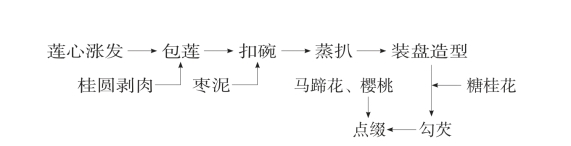 (1)莲心预处理:将莲心蒸熟至酥,取1/3用桂圆肉包被。取1/3打碎成泥用50克白糖、25克猪油炒起黏成馅。