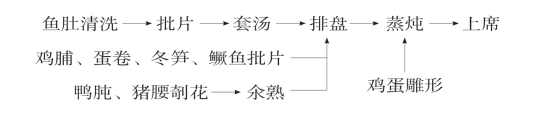 (2)排扣造形:取20寸大汤盘1只,将鱼肚垫底,鸡脯、火腿、虾卷、冬笋在盘中满排十形,一面一料,四角空处呈放射状排叠鱼片、香菇、鸭肫和腰花。将菜心一剖两在四角,菜头朝中点缀十字。