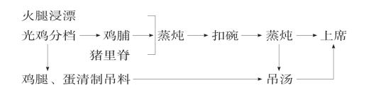 (1)蒸炖:①将光鸡分档,取鸡腿剁碎加蛋清、盐2克、水100克、酱油0.5克、姜5克、葱5克、绍酒5克,和匀做吊汤料待用。②将火腿泡去2/3咸味洗刮干净,与鸡脯,猪里脊一同焯水,蒸炖至烂。