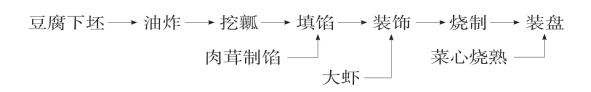 (1)炸坯:将豆腐改刀成5厘米×3厘米×3厘米长方块10块,投入200℃油中炸至结壳两面金黄,捞出晾凉。在一侧大面各开一个长方形盖口,剜去内部2/3豆腐,保持外壁完好。