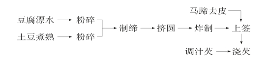 原料:豆腐300克,去皮土豆400克,青豆25克,葱段20克,鸡蛋2只,味精2克,蘑菇粉2克,绍酒10克,精盐5克,干淀粉50克,湿淀粉20克,荸荠20粒,铁签10拔,姜、葱末各5克,白兰地酒25克,宴会酱油5克,番茄酱30克,果醋10克,红油5克,蜂蜜10克,吉士粉5克,白胡椒粉2克,姜汁5克,精炼油1500克(耗100克)。
