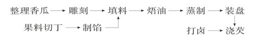 (1)整理:选用圆整无斑金黄皮色、香味浓郁的香瓜,刷洗干净,在1/6处蒂下开盖,在瓜身浅刻图,最后取出瓜瓤。