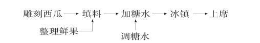 (1)雕刻:①从大西瓜1/3处用圆刀戳下作盖,底部修平,瓜身刻四种实环和浅刻图案,挖出瓜瓤做容器外套,瓜盖亦刻圆环突出待用。②小西瓜亦由1/3处剖开,上部刻花纹作底架,下部刨去外皮,挖出瓜肉做容器内胆。