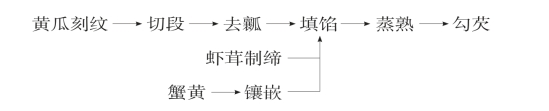 (1)黄瓜处理:选择直径2.5~3厘米嫩黄瓜洗净,用小槽口刀刻出风轮长条纹,再切成6厘米斜刀段,用圆口刀戳去瓜瓤,用盐1克拌匀待用。