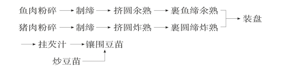 (2)挤圆造型:①将鱼缔挤出直径2厘米圆子入95℃热水中氽熟提出冷却,再用肉缔裹挤成直径3厘米圆子入140℃热油中温炸成熟,装盘。②将肉缔挤出2厘米直径的肉圆入油锅炸熟,再如上法裹一层鱼缔入水氽熟待装盘。