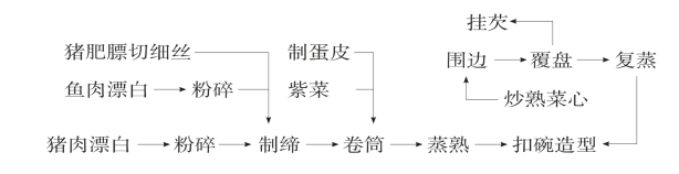 (1)制缔:①将鱼肉拍粉,猪肉切片分别漂白,粉碎至极细,同置盆中加清水50克,姜葱汁、绍酒、2只鸡蛋、精盐4克、味粉2克、淀粉30克与芝麻油混合搅拌起黏成缔。②将猪肥膘切成细丝拌入缔中,即成卷切馅心。