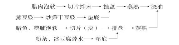 (1)备料:①将三腊料用清水浸泡回软,咸味淡化分别批(切)成有规律的片或块待用。②豆豉用绍酒5克撒拌蒸透,与笋干片一道入锅,加清油50克、白糖5克、味精1克炒香,另将豆粉条与冰豆腐焯水待用。