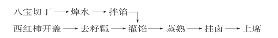 (3)蒸熟成菜:从西红柿蒂部下侧开盖,掏去籽瓤,将馅子填入柿盅里,加盖,置10只玻璃小碗里。