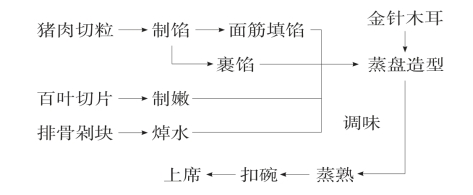 (1)制馅:①将干贝加鸡汤、黄酒蒸发,揉碎,原汤澄淀冷却。②将猪肉切成米粒状,加干贝茸及原汤、精盐1克、味精2克、绍酒5克、酱油、白溏与葱末混合搅拌成馅。