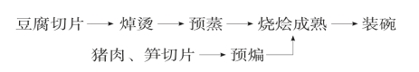 (2)加热至熟:将熟猪肉与熟笋匀切成4厘米×2厘米薄片,虾籽3克同姜、葱一道入锅煸香,加肉汤、虾油卤、绍酒烧沸,放入豆腐烧入味。勾芡装碗,另用鸡油加热至120℃下虾籽2克,葱末冲油浇在豆腐上再撒下虾仁即可。