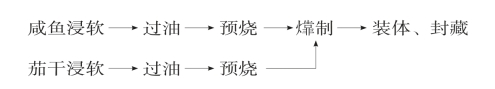 (1)预加工:①将风咸青鱼肚档洗净浸在清水里10小时使之脱去部分咸味,再切成丁或条,入180℃油中炸至起面。②将茄干亦浸软,切成丁或条入180℃油中炸起色。