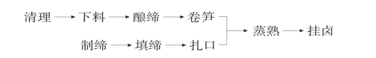 (2)生坯造型:①将虾茸、肥肉茸、鸡蛋清、精盐、鸡精、干淀粉20克、姜葱汁、绍酒混合起黏成为虾缔。②取1/3虾缔与火腿茸、香菇粒(4只)、葱末拌匀成馅,分别填入竹荪筒内,用芹丝扎起两端成气袋形待用。③将竹荪一面遍撒干淀粉,将2/3虾缔均匀平酿在竹荪片上,将芦笋卷起,修齐根端,露出笋尖,成洞箫造型待用。