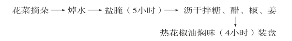 原料:花菜600克,红泡椒丝20克,生姜丝5克,精盐15克,白糖150克,白醋70克,花椒油75克。