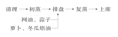 (3)制熟加工:①将瑶柱整齐排在盘中,蒜子、萝卜、瓜球间夹围于四周。②将网油略烫,盖在盘上,原汤过滤注入,再加50克花雕密盖,用旺火蒸30分钟取出,揭去网油即可。
