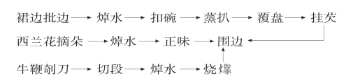 (4)组合成菜:将裙边覆盘,原卤加鸡油勾流芡浇上,围上西兰花,再围上鞭花即成。
