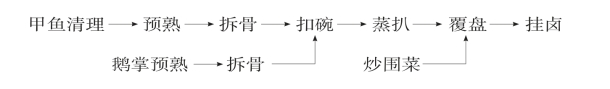 (1)甲鱼处理:将甲鱼宰杀去内脏及黄油,烫洗去黑膜,拆出裙边,另将甲鱼身块入锅,加姜、葱5克与蒜子煸香,加绍酒10克与适量水略焖至肉软取出拆去肢骨。