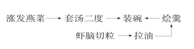 (2)烩羹成菜:将虾脑切成石榴粒状,用80℃油温拉油至刚熟时捞起。空锅上火,下上汤400克,虾脑、绍酒及余下所有调料烧沸,用湿淀粉勾流芡下芝麻油包尾拌匀,出锅盛在燕菜上即成。
