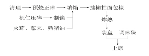 (2)制馅:将核桃仁压成碎粒,与火茸、花椒粉、熟猪油、葱末、精盐2克,鸡精粉3克调和拌匀成馅。