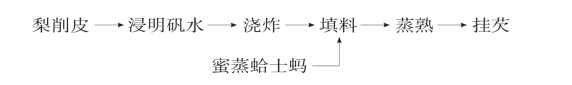 (1)梨子处理:逐一将梨子旋削去皮,从蒂下2.5厘米切下作盖,用挖刀挖出梨核及部分梨肉,浸入5000克淡食矾溶液中,完毕控去水分,用180℃热油浇炸至表皮起光待用。