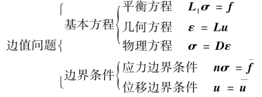 弹性理论问题的定解条件为:弹性体的应力σ、应变ε以及位移u,应当满足弹性理论3组基本方程,包括平衡微分方程[式(1.2)]、几何方程[式(1.7)]以及物理方程[式(1.16)],同时满足所有边界条件,包括应力边界条件(1.26)和位移边界条件(1.23),即为求解偏微分方程的边值问题。