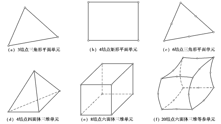 图2.1给出了一些从几何特征上分类的平面问题和三维应力问题常用单元。