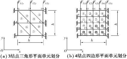 采用3结点三角形平面单元,对图2.3(b)所示结构进行划分。整体结构划分为8个单元,结点为铰接。共计设置9个结点,18个自由度,如图2.4(a)所示。
