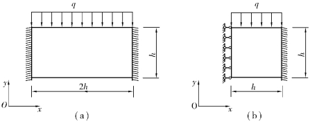 如图2.3(a)所示为一深梁构件,不计自重,将其简化为平面应力问题。根据对称性取其模型进行分析[图2.3(b)]。