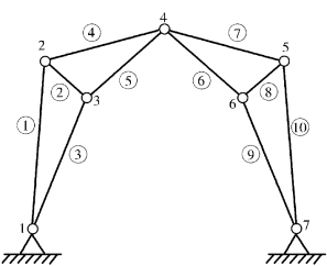 对于杆系结构,其由一些简单构件组合而成,分析时一般无须再加以分割,可将这些杆件设置为自然单元。如图2.5所示的三角拱架结构中,各直杆构件就是一种自然单元,通常采用①,②,…符号表示标号,通常也称为自然离散。值得指出的是,一个结构的自然构件在分析时能否看作自然单元,将取决于所研究的范围和构件本身的力学行为。