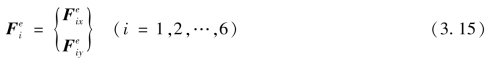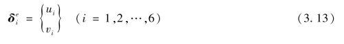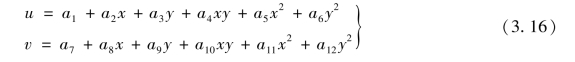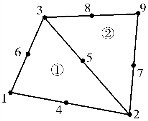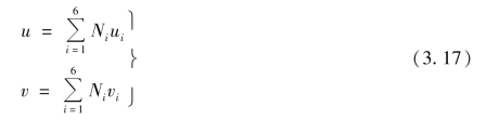 图3.4所示,两个相邻的6结点三角形单元,结点2,5,3连线为其公共边界。对于单元①,位移模式(3.16),使得单元位移函数在公共边界上为坐标的二次函数,且由结点2,5,3确定的二次函数是唯一的。同理单元②的位移函数在公共边界亦为由结点2,5,3唯一确定的二次函数,于是,在弹性体变形过程中相邻单元公共边界上位移始终保持协调,因此,由式(3.16)所确定位移函数的单元为完备协调单元。