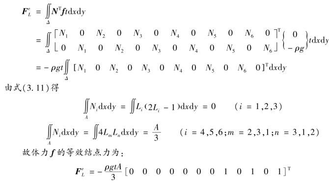 可以看出,6结点三角形单元承受自重荷载时,只需向3个边中结点各移置单元自重的,3个角结点上等效结点力为零。该结果与静力等效结果有所不同。