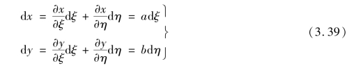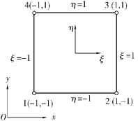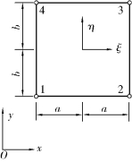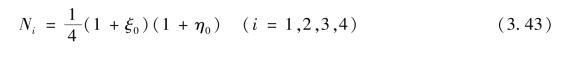 于是,矩形单元均可变换为边长为2×2的正方形单元,如图3.8所示。形函数的构造将在局部坐标系(ξη)中进行,而通过坐标变换式(3.36),可将局部坐标系中构造的形函数映射到整体结构中所有矩形单元。
