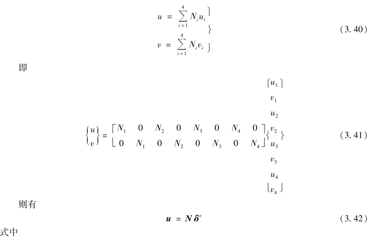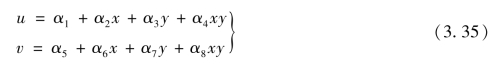 由于矩形单元其边界总是平行于坐标方向的,因此,在任意边界上位移函数均为x或y的线性函数,式(3.35)也称为双线性模式。单元位移模式包含完全的一次项,满足完备性要求。单元各边界均包含两个结点,可唯一确定线性函数,故满足连续性条件,单元为完备协调元。