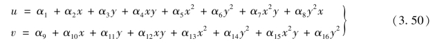 式(3.50)为不完全3次多项式,单元位移模式包含完全的一次项,满足完备性要求。由于矩形单元其边界总是平行于坐标方向的,因此,在任意边界上位移函数均为x或y的二次函数。单元各边界均包含3个结点,可唯一确定二次函数,能够保持相邻单元公共边界上位移的协调性,因此该单元为完备协调元。
