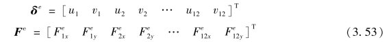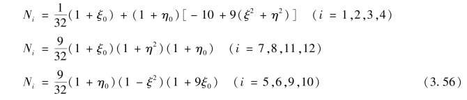 图3.10所示为12结点矩形单元,在4个角结点和各边三分点设置2个结点,每个单元有24个自由度。单元结点位移列阵和单元结点力列阵分别为