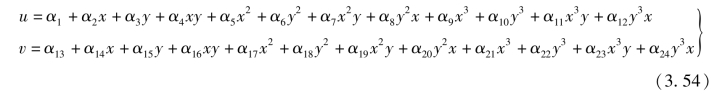 式(3.54)为不完全4次多项式,单元位移模式包含完全的一次项,满足完备性要求。同前述分析,在任意边界上位移函数均为x或y的三次函数。单元各边界均包含4个结点,可唯一确定三次函数,能够保持相邻单元公共边界上位移的协调性,因此该单元为完备协调元。