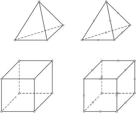 实际工程中,除了一些问题在特殊条件下可以简化为平面问题等外,一般多属于空间问题计算。对于空间问题,在进行有限元分析时,首先将弹性体离散成三维应力单元进行分析。空间问题有限元分析的基本单元为四面体和六面体单元(图4.1)。