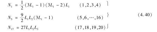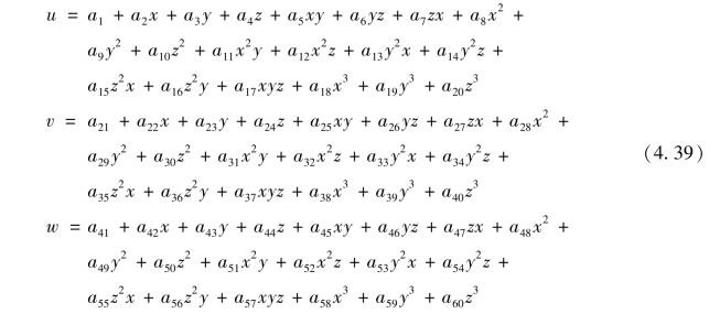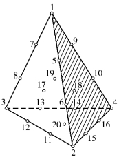 如图4.7所示为20结点四面体单元,设置20个结点。取4个角点,6条棱边的三分点及4个表面的形心。