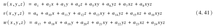 由式(4.41)可知,单元位移函数在各边界上均为x,y,或y,z,或z,x的一次方程。例如,在边界1256面(图4.7),z=常数,单元位移函数u为x,y的一次方程。