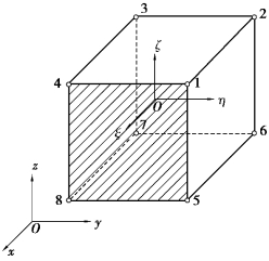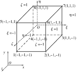 于是,通过坐标变换,任意六面体单元均可变换为边长2×2×2的正六面体单元,如图4.9所示。单元位移形函数的构造将在局部坐标系ξηζ中进行,而此形函数可映射到整体结构中所有六面体单元。