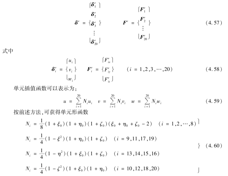 如图4.10所示为20结点六面体,取8个角点,12条棱边的中点。每个结点有3个位移分量,单元共有60个自由度。位移模式可取为: