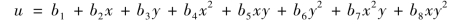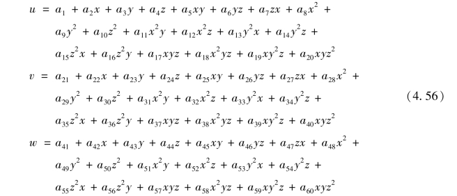 由式(4.56)可知,单元位移函数在各边界上均为x,y,或y,z,或z,x的二次函数。例如,在边界1256面(图4.7),z=常数,单元位移函数u为x,y的二次函数