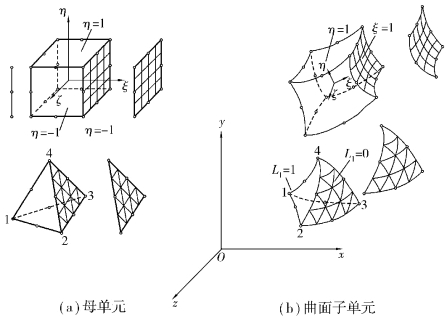 图5.2所示为两种三维空间单元,实际单元为图5.2(b)中的曲边六面体单元和曲边四面体单元,图5.2(a)则表示在局部坐标系中的规则单元,即母单元。通过坐标变换,图5.2(b)中20结点曲边六面体单元映射成为图5.2(a)中局部坐标系ξηζ中边长为2×2×2的20结点正方体母单元;10结点曲面四面体单元则映射成为体积坐标表示的10结点正四面体母单元。
