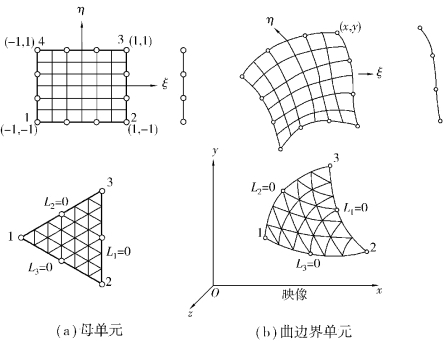 图5.1所示为两种平面单元,实际单元为图5.1(b)中的曲边四边形单元和曲边三角形单元,图5.1(a)则表示在局部坐标系中的规则单元,称作母单元。通过坐标变换,图5.1(b)中12结点曲边四边形单元映射成图5.1(a)所示局部坐标系ξ-η中边长为2×2的12结点正方形母单元;6结点曲边三角形单元则映射成图5.1(a)所示用面积坐标表示的等边三角形母单元。